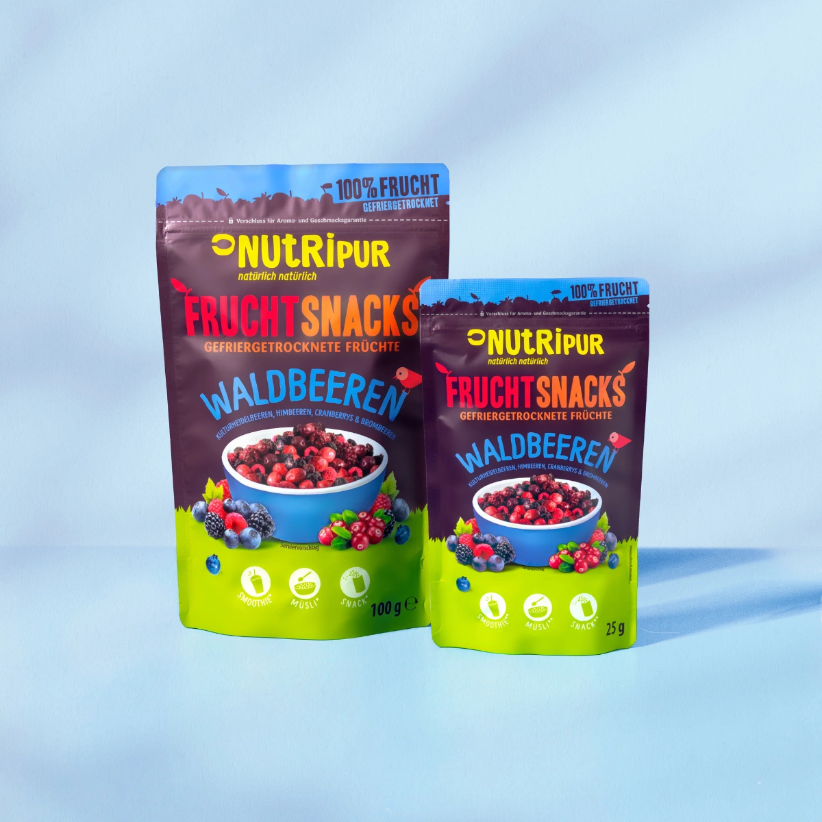 Mélange de fruits lyophilisés à base de myrtilles cultivées, de framboises, de cranberries & de mûres, plein de goût et d’arôme. Sans sucre ajouté, végétalien et non sulfuré. Fabriqué avec soin en Allemagne. Un délicieux SNACK MIX de FRUITS lyophilisés pour la route ou parfait pour les smoothies, les yaourts, les jus, les thés, dans le muesli et le porridge ou le fitness shake ! Une QUALITÉ qui se goûte: des fruits séchés de première qualité dans un sachet refermable de 25 g ou 100 g à fond plat. Conservation à l’abri de l’air pour préserver l’arôme et la saveur des fruits secs.