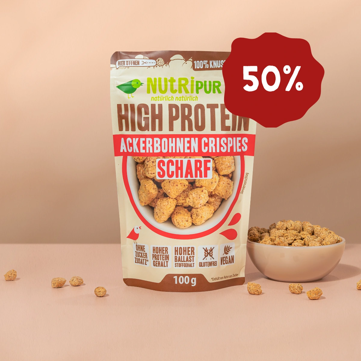 Découvre le croustillant ultime et la teneur en protéines imbattable de nos High Protein Féverole Crispies Chili !