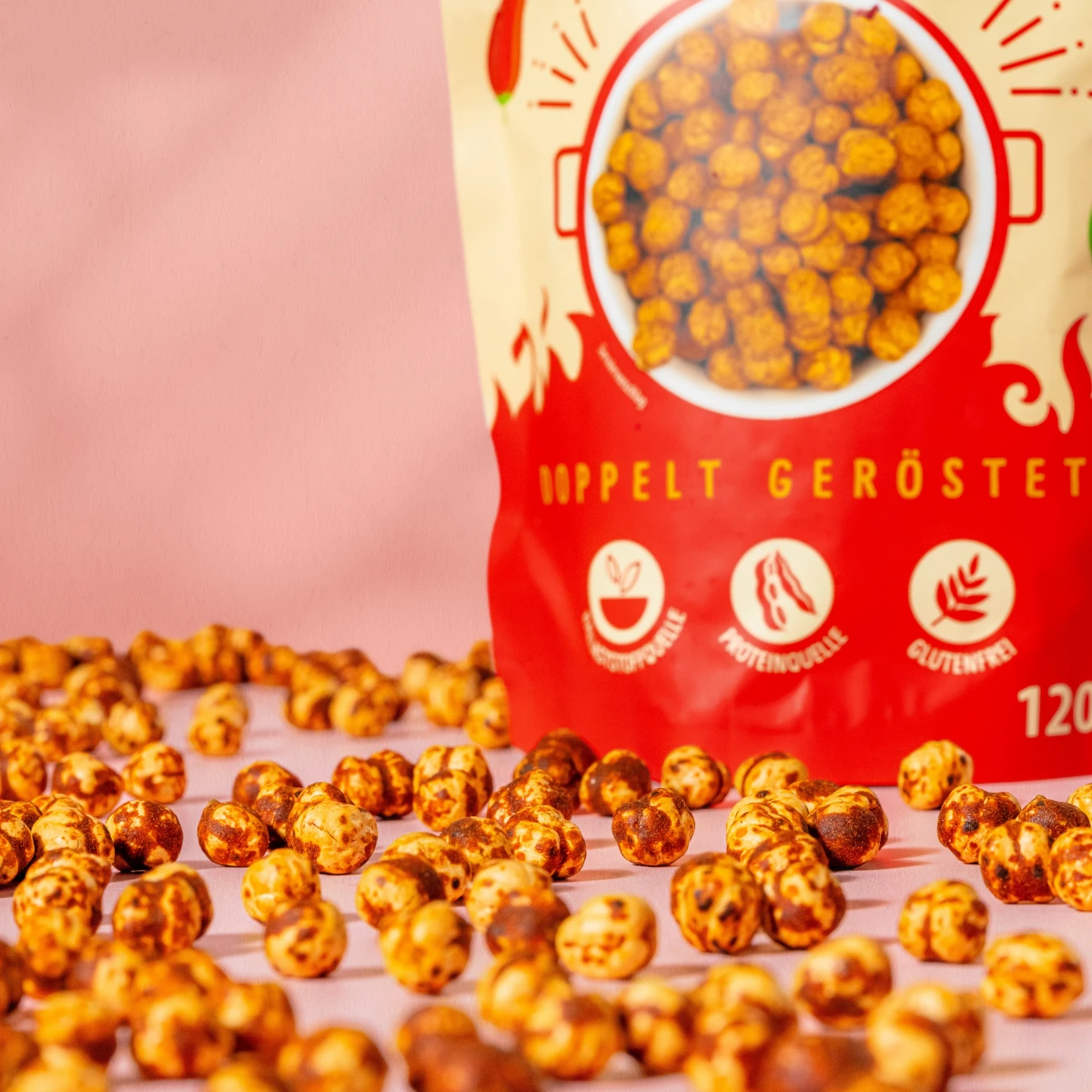 Avant que les pois chiches ne sautent dans le sac, nous effectuons quelques étapes de transformation en douceur. Les pois chiches sélectionnés sont chauffés et humidifiés plusieurs fois dans un four spécial. Entre chaque étape, les petits snacks à mâcher reposent quelques semaines. Pour finir, les pois chiches sont délicatement grillés et affinés avec des herbes et des arômes sélectionnés. Avant même que tu t’en rendes compte, tu retrouveras les snacks à ricaner dans ta salade, ton bowl, ta soupe et ton plat préféré.